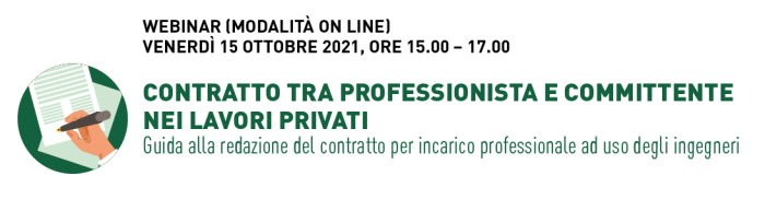 L’obiettivo del webinar è di fornire agli ingegneri che operano nella libera professione indicazioni utili alla predisposizione di un contratto per l’esecuzione di lavori di progettazione o di direzione dei lavori in ambito privato. Verrà affrontato il tema della responsabilità contrattuale e verranno illustrate alcune proposte di modello contrattuale.